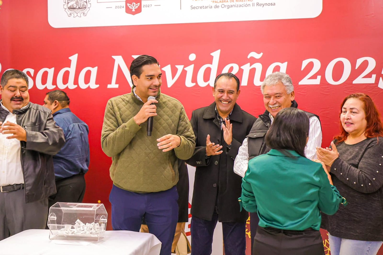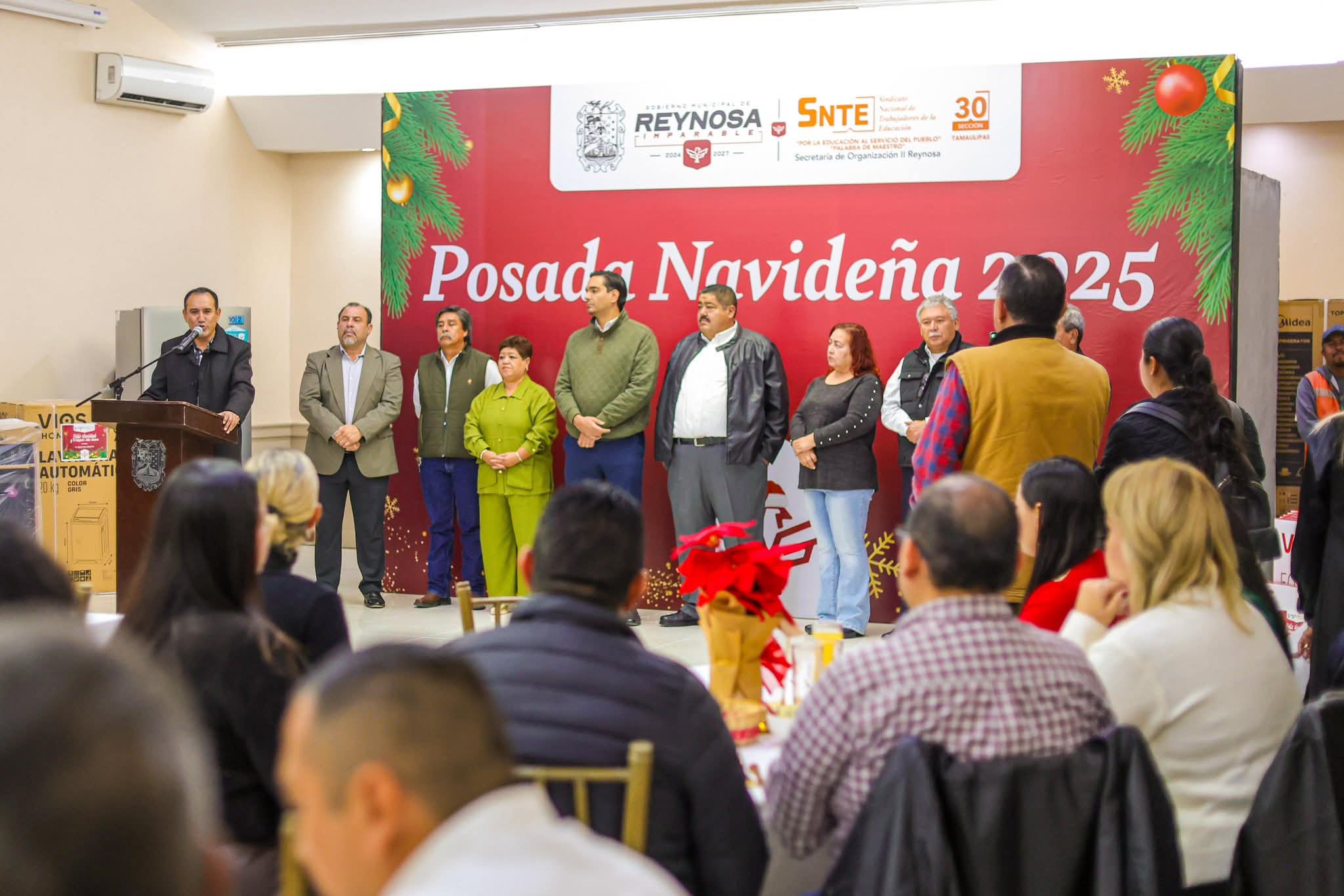 El magisterio reynosense convivió con el Alcalde Carlos Peña Ortiz como su invitado especial en la Posada Navideña de la Secretaría de Organización II del SNTE, a la que convocaron los Maestros Jorge Guadalupe Acuña Tovías y José Iram Rodríguez Limón.